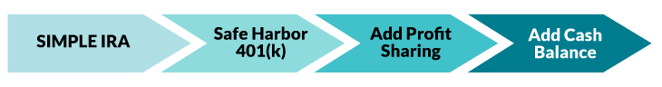 They start with a SIMPLE IRA and eventually switch to a 401(k) for greater savings potential. If desired, they can add a Profit-Sharing element or even a Cash Balance plan on top of their existing 401(k) plan.