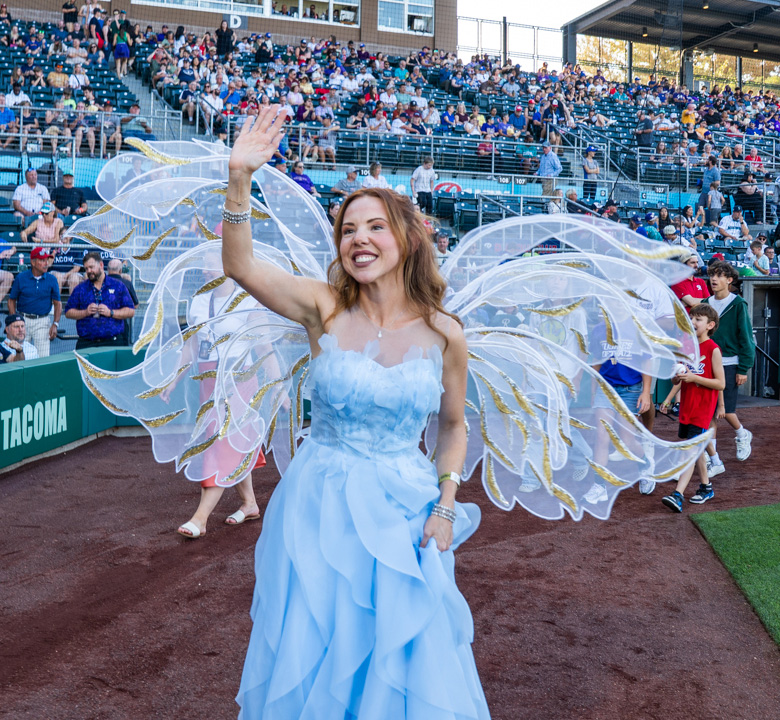 Lumi waving to fans after throwing out the first pitch at a Tacoma Rainiers game, Fall 2025.