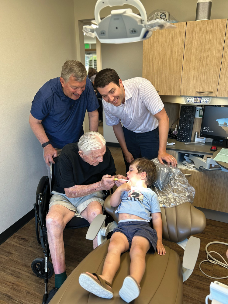 Four generations together: Dr. Dick Washut cleans his great-grandson’s teeth as his son Dr. Rick Washut and grandson Dr. Kyle Washut supervise.