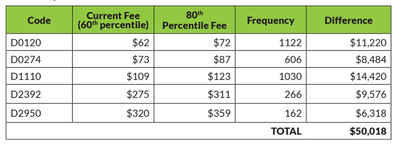 With 30 codes accounting for 90% of production, optimizing fees is critical. Moving from the 60th to the 80th percentile can generate thousands in additional revenue annually with minimal patient impact (see example below).
